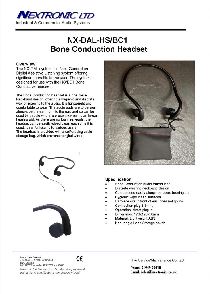 The NX-DAL system is a Next Generation Digital Assistive Listening system offering significant benefits to the user. The system is designed for use with the HS/BC1 Bone Conductive headset.